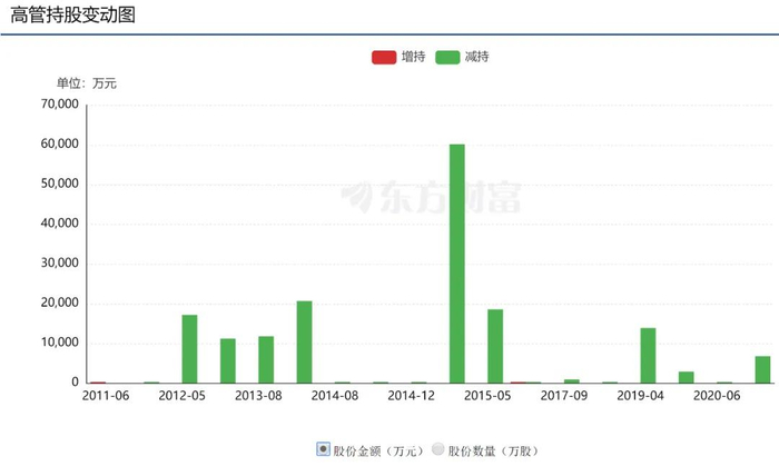 从下面的高管持股变动图可以看出,红柱为增持,绿柱为减持。