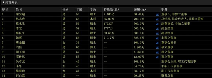 董事长梁允超,薪酬虽然只有60来万,但持股数高达7.1亿股,占公司总股份的41.78%,是绝对的实控人。