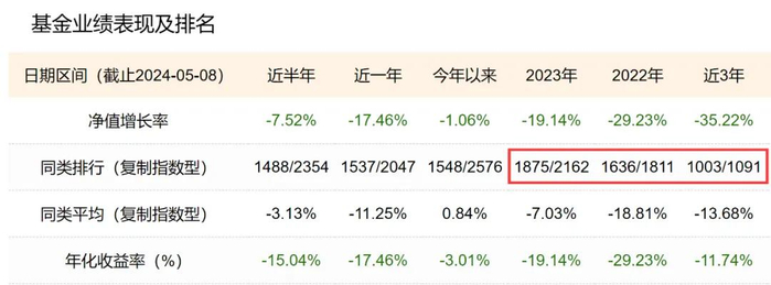 最近三年,它在同类排行中都是稳居倒数前列,在同类1091只基金中竟然排在了1003名,是妥妥的倒数前10%。