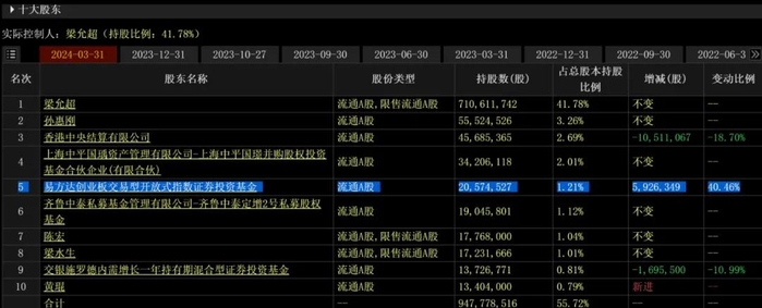 它就是易方达创业板交易型开放式指数证券投资基金(即易方达创业板ETF),它在今年一季度增持约592.6万股,增持比例高达40.46%!