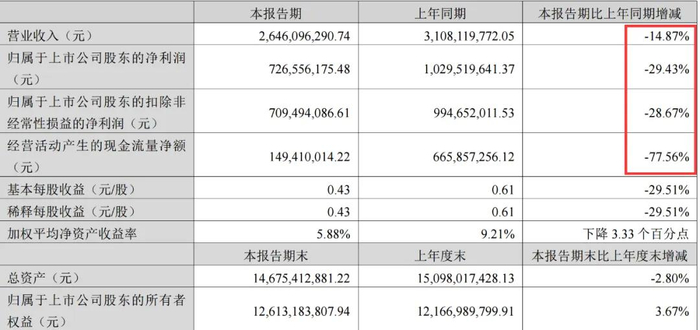 营业收入26.46亿元,同比减少近15%;净利润7.26亿元,同比减少近30%;扣非后净利润7.09亿元,同比减少近29%;经营活动产生的现金流净额1.49亿元,同比大幅减少近78%。