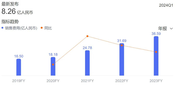 2019-2023年,汤臣倍健销售费用分别为16.5亿元、18.18亿元、24.78亿元、31.69亿元,38.59亿元。