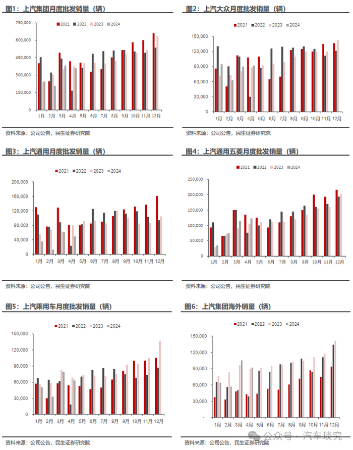 上汽集团发布2024年4月产销快报:4月集团批发销量36.0万辆,同比-3.7%,环比-5.6%;2024M1-4集团累计批发销量119.4万辆,同比-5.6%;上汽大众4月批发9.2万辆,同比+4.2%,环比+2.2%;2024M1-4累计批发34.0万辆,同比+8.1%;上汽通用4月批发5.0万辆,同比-37.9%,环比-19.9%;2024 M1-4累计批发16.1万辆,同比-39.4%;上汽乘用车4月批发6.3万辆,同比-7.2%,环比-19.9%;2024 M1-4累计批发22.6万辆,同比-14.7%;上汽通用五菱4月批发12.3万辆,同比+16.8%,环比+7.9%;2024 M1-4累计批发34.7万辆,同比+16.5%。02分析判断