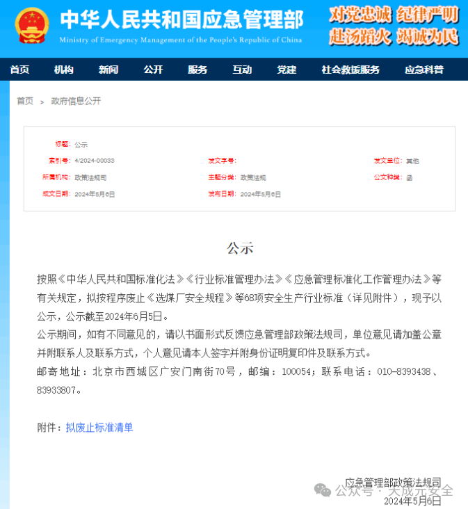 拟按程序废止68项安全生产行业标准(详见附件),现予以公示,公示截至2024年6月5日。