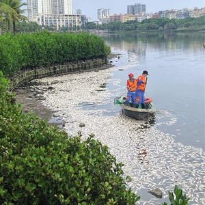 “我们昨天就开始捞了,今天也是早上7点就捞到现在,死鱼太多了,刚捞完过一会就又浮上来了。”现场打捞的环卫工介绍,这些打捞上来的死鱼会统一送到指定点位进行无害化处理,确保死鱼不流向市场。