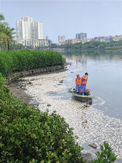 本报讯 5月12日,市民刘先生向记者反映,海口红城湖湖面漂浮大量死鱼,散发着难闻的腥臭味。记者来到现场时,已有超过10名环卫工人在打捞死鱼。记者 林道亨 文/图