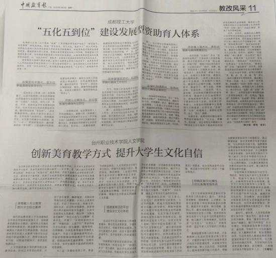 创新美育教学方式,开设传承地域传统文化艺术选修课程。立足本校实际和高职学生特点,创新美育课程体系,弘扬中华优秀传统文化、历史文化,彰显文化遗产的美育价值,推进非物质文化遗产、地域传统文化进校园进课堂进头脑,开设开设《无骨花灯艺术》《藤编艺术》《草编艺术》《茶艺》等传承地域传统文化艺术的选修课程,提升学生的人文艺术修养和审美鉴赏水平,让中华优秀传统文化在美育教学中得到体现、传承和发展。草编艺术是台州的优秀传统文化,2012年被列入国家非物质文化遗产项目,具有丰厚的文化底蕴和文化积淀。为了更好地传承和发扬草编文化,人文学院与台州市非遗草编艺术第四代传承人、非遗草编技艺保护单位——浙江凯佩诗雅工贸有限公司总经理陈真团队合作设计开发草编特色课程,将复杂的工艺技法拆解为一堂堂生动有趣的手工课程,让学生在设计、制作的过程中体验动手实践的乐趣和成就感,在参与中华优秀传统文化的传承弘扬中提高文化品位和人文素养。《创新美育教学方式提升大学生文化自信》和《非遗文化进校园以匠心致传承》介绍学校美育教育教学情况的《中国教育报》予以报道。