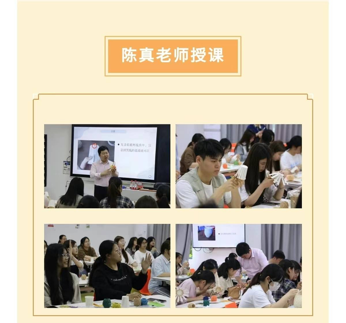 组织开展非遗文化专题讲座。为弘扬台州优秀传统文化,传承非物质文化遗产,人文学院联合浙江凯佩诗雅工贸有限公司、仙居县吉弘灯彩有限公司开展非物质文化遗产进校园讲座活动,校企合作探寻中华优秀传统文化之美。邀请台州市非遗草编艺术第四代传承人、浙江凯佩诗雅工贸有限公司总经理陈真作《非遗草编技艺的传承与传播》专题讲座,介绍了草编艺术文化、草编新材料、草编工艺手法及草编艺术作品制作流程,教授草编制作方法等;邀请国家级非物质文化遗产项目仙居花灯传承人、台州市《非物质文化遗产仙居花灯传承基地》主要负责人何文斌作《仙居针刺无骨花灯制作技艺》专题讲座介绍仙居针刺无骨花灯的历史文化和制作技艺,教授无骨花灯制作方法,提升教师的非遗文化认知水平,推动《草编艺术》、《无骨花灯艺术》等美育课程开发和美育项目实施。