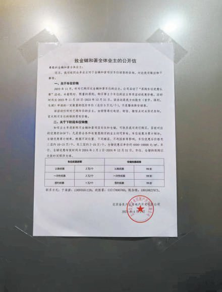 公开信显示,金良兴业公司针对车位价格及下一阶段车位销售等问题给出回应:“自2023年11月25日至2023年12月31日,针对已购买过车位的业主,公司启动了‘再购车位优惠认筹’活动,本着限时、限量原则,购买第二个车位的业主享受活动优惠价格。”“该活动是我方向股东(首开、保利、龙湖)申请的一定数量的低价车位,总价5万元/个,不是整体降价销售。”公开信还写着,“该活动针对已购车位业主。由销售通过电话、短信、微信‘点对点’形式告知。”