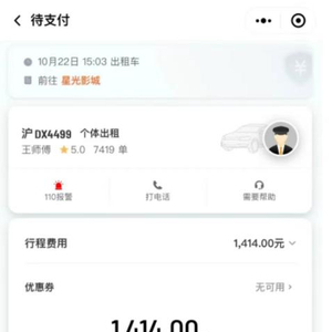 5月12日,记者联系上上海女生小关(化名),她表示,她11日突然在滴滴出行上发现有一张2017年的订单,“不知道为什么有张千元订单一直未支付。”记者从小关提供的订单截图上看到,该行程发生在2017年10月22日,是一辆沪DX的出租车接单,开始时间为下午3时03分,虽然小关表示对这趟行程没有什么印象,但费用让她大吃一惊:1414元。