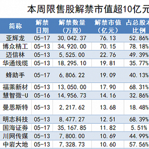 IVD(体外诊断产品)企业亚辉龙是本周解禁规模最大的公司。根据公告,公司5月17日有3.00亿股首发限售股解禁,占总股本比例超过50%,约合解禁市值76.13亿元。