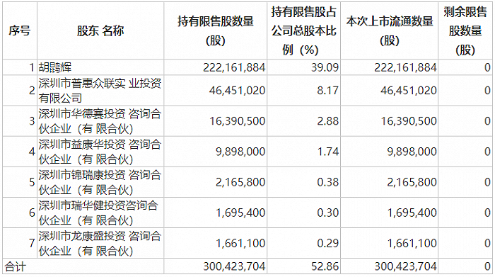 亚辉龙上市将满三年,此次解禁股东共7位,实控人、董事长胡鹍辉占大头持股比例39.09%,第二大股东深圳市普惠众联实业投资有限公司持股比例为8.17%,此外还有5家投资咨询公司。