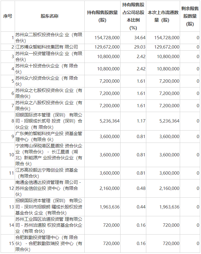 公司此次解禁股东共15位,包括第一大股东苏州众二股权投资合伙企业(有限合伙),第二大股东江苏博众智能科技集团有限公司,二者持股比例分别为34.64%和29.03%。其余13位股东解禁后存在一定的减持概率。