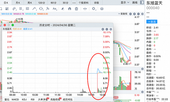 耐人寻味的是,停牌前最后一天4月30日,股价原本一开盘锁定了“跌停价”,但在尾盘却有神秘资金试图撬开跌停板,最终使得东旭蓝天4月30日的跌幅定格在9.74%。