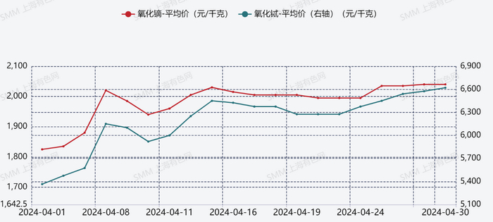 原材料成本较高和供应量相对较少的背景下,氧化物作价格也维持在较高水平。进入5月份,在市场众多利好消息的因素加持下,稀土价格延续前期的偏强走势,但高昂的原材料价格和供应的不确定性,使得终端买家在采购时更加谨慎,市场博弈情绪渐浓,这可能导致市场交易的僵持和价格波动的不确定性。SMM预计后续稀土产品价格走势将以窄幅震荡运行为主。