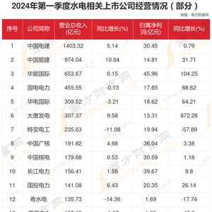 这些上市公司中,长江电力注册资本高达244.7亿,2024年第一季度公司营业收入156.41亿元;华能水电注册资本180亿,2024年第一季度公司营业收入44.2亿元;国投电力、甘肃能源、乐山电力、明星电力、西昌电力注册资本分别为74.54亿、16.01亿、5.38亿、4.21亿、3.65亿,2024年第一季度营业收入分别为141.08亿、5.05亿、8.28亿、6.98亿、3.61亿。