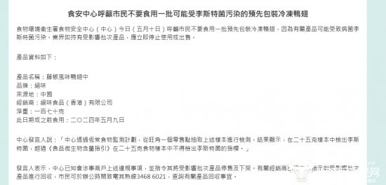 中国香 港食物环境卫生署食物安全中心5月10日发布的公告显示,中心透过恒常食物监测计划,从一批品牌为绝味,名称为藤椒风味鸭翅中,经销商为绝味食品(香 港)有限公司的产品里抽取了样本进行检测,结果测出了李斯特菌,超过了《食品微生物含量指引》在25克食物样本中不得检出李斯特菌的指标。