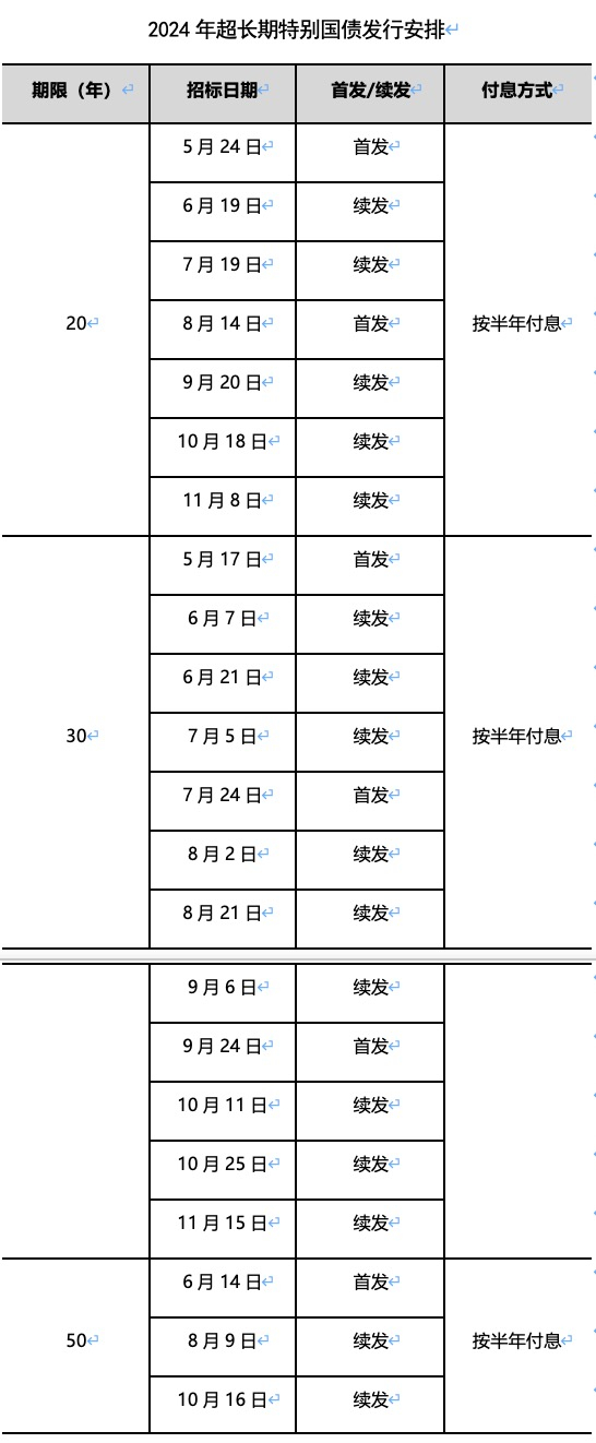 根据此次安排,决定5月17日发行30年超长期特别国债,5月24日发行20年超长期特别国债,6月14日发行50年超长期特别国债。