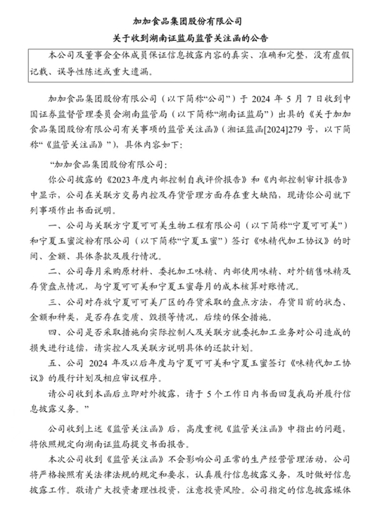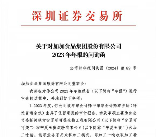 近日,ST加加(加加食品,002650.SZ)因在关联方交易内控及存货管理方面存在重大缺陷,收到湖南证监局出具的监管关注函。同日,深交所向其下发2023年年报问询函,函告中一连提出八项问题。