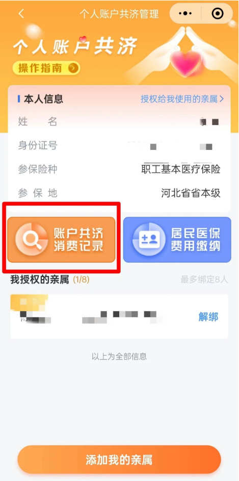4、家庭成员管理:参保人进入个人账户共济管理页面,可查询绑定的亲属账户共济消费记录等信息。如需要解除绑定关系,职工参保人可选择需要解绑的家庭成员,通过“解绑”操作完成关系解绑。