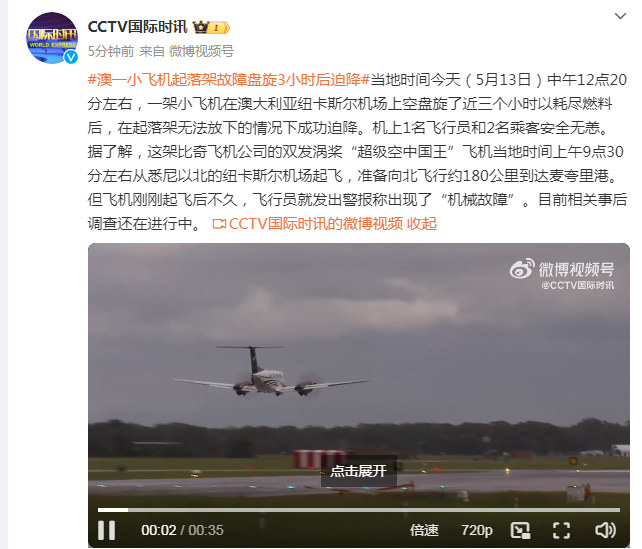 澳一小飞机起落架故障,盘旋近三小时耗尽燃料后成功迫降
