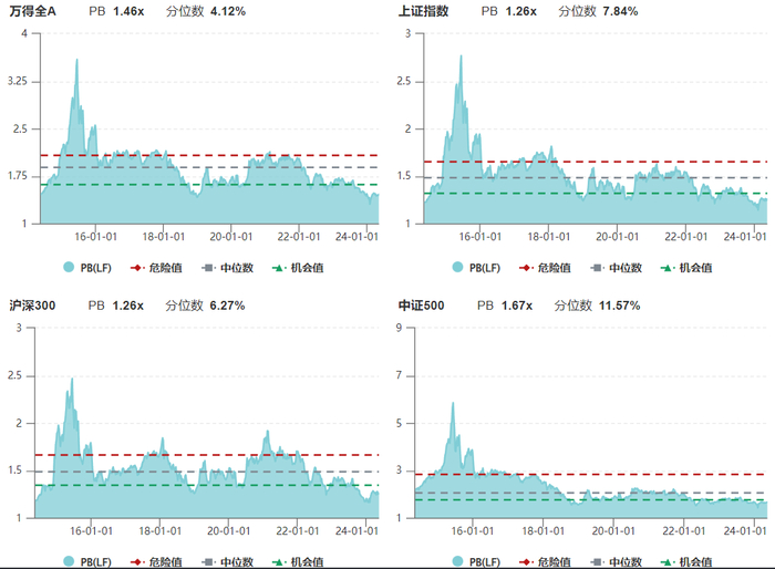 Wind数据显示,目前万得全A、上证指数、沪深300和中证500等指数市净率均处于近十年估值洼地。如万得全A最新PB仅1.46倍,处于近10年估值百分位的4%,估值低于近10年96%的时间;沪深300最新PB仅1.26倍,处于近10年估值百分位的6%,估值低于近10年94%的时间。