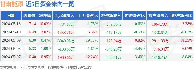 证券之星消息,甘肃能源涨停收盘,收盘价7.14元。该股于9点30分涨停,6次打开涨停,截止收盘封单资金为5081.64万元,占其流通市值0.44%。