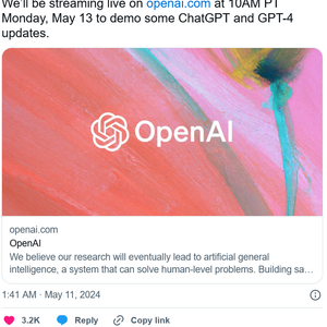 OpenAI宣布将于5月13日直播演示ChatGPT和GPT-4功能更新 图片来源:X