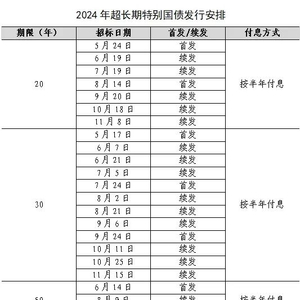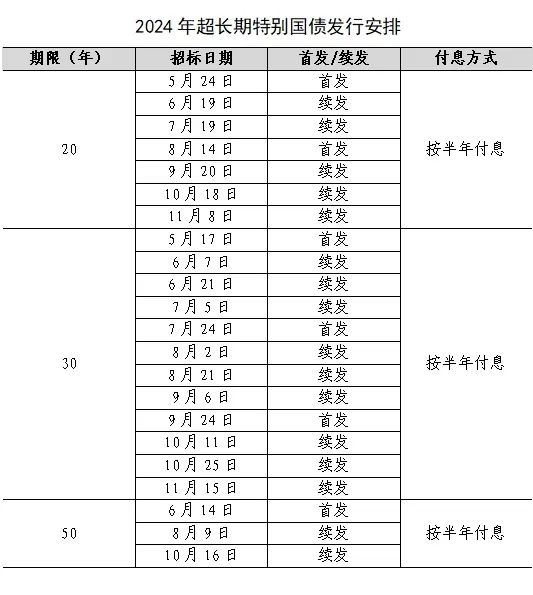5月13日,财政部发布《2024年一般国债、超长期特别国债发行有关安排》,其中超长期特别国债涉及期限为20年、30年、50年,决定5月17日发行30年超长期特别国债,5月24日发行20年超长期特别国债,6月14日发行50年超长期特别国债。