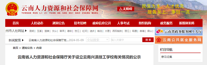 云南省人力资源和社会保障厅关于设立云南兴滇技工学校有关情况的公示