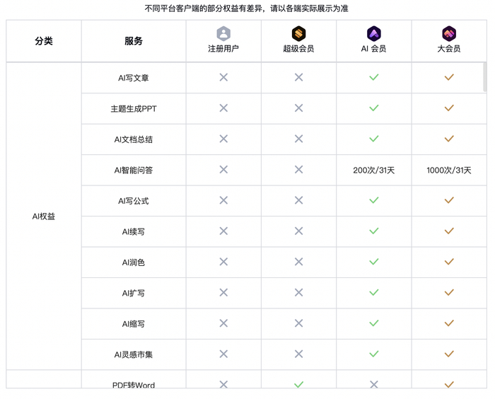 会员从两种升级为三种其实并不复杂,但造成消费者体感误区的关键,正是在于灰度测试到正式发布的过渡期。灰测期,消费者可以免费使用WPS AI,但未来随着WPS AI商业化进程的推进,新的体系将重新收费、定价,这极易造成消费者产生心理变化。