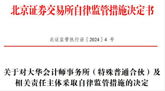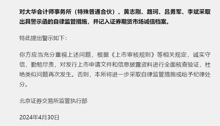 4月30日,北交所公布的罚单显示,大华所以及富耐克IPO项目签字会计师黄志刚、路珂、吕勇军、李斌被采取出具警示函的自律监管措施,并记入证券期货市场诚信档案。