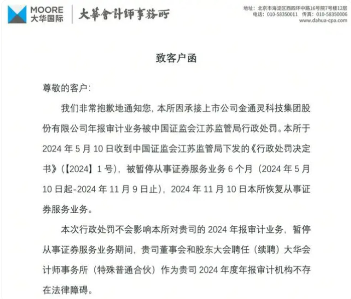 国内公认的八大会计师事务所之一大华所,也倒在上市企业的连续造假上——大华所被江苏证监局暂停从事证券服务业务6个月(5月10日至11月9日)。事出上市企业金通灵,大华所已向服务的客户发函,告知上述行政处罚情况。