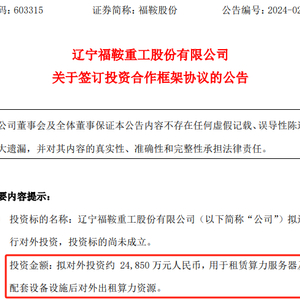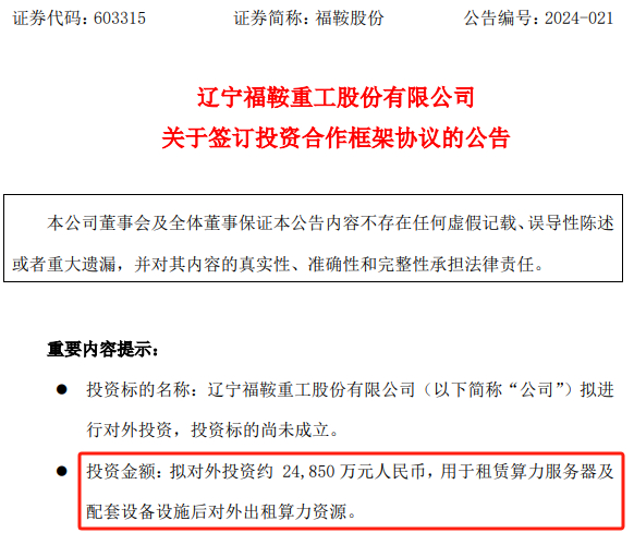 见习记者 闻言又有A股公司跨界算力租赁!5月13日晚间,福鞍股份公告称,公司拟以现金出资方式设立合资公司,开拓AI算力租赁服务业务,按出资比例拟投资2.485亿元。