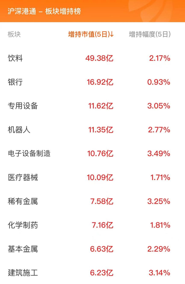 数据显示,近五个交易日,北向资金增持饮料板块49.38亿元,增持银行板块16.92亿元,增持专用设备板块11.62亿元。水务板块近五日增持幅度最大,增幅为19.51%,增持市值合计2.93亿元。