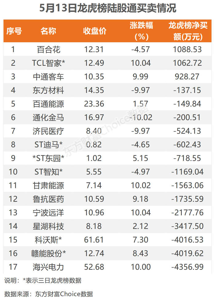 5月13日,陆股通参与龙虎榜中个股共涉及17股,其中3股被陆股通净买入,百合花被买入最多,净买入1088.53万元;另外14股被陆股通净卖出,海兴电力被卖出最多,净卖出4356.99万元。