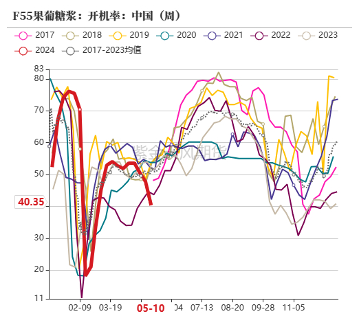 截止5月10日当周,F55果葡糖浆开机率为在40.35%,开工较上周下滑7.43个百分点,五一假期期间,部分企业挺价限产,导致开工下滑;麦芽糖浆开工率为47.37%,环比上周下滑1.97个百分点,下游需求淡季,五一期间部分企业限产,导致开工下滑;瓦楞纸开机率60.38%,环比上周降低2.46%;箱板纸开工63.71%,环比上周降低1.21%。