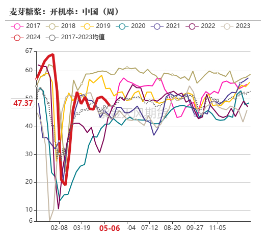 截止5月10日当周,66家企业淀粉开机率为67.95%,较上周升高1.6%。