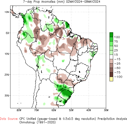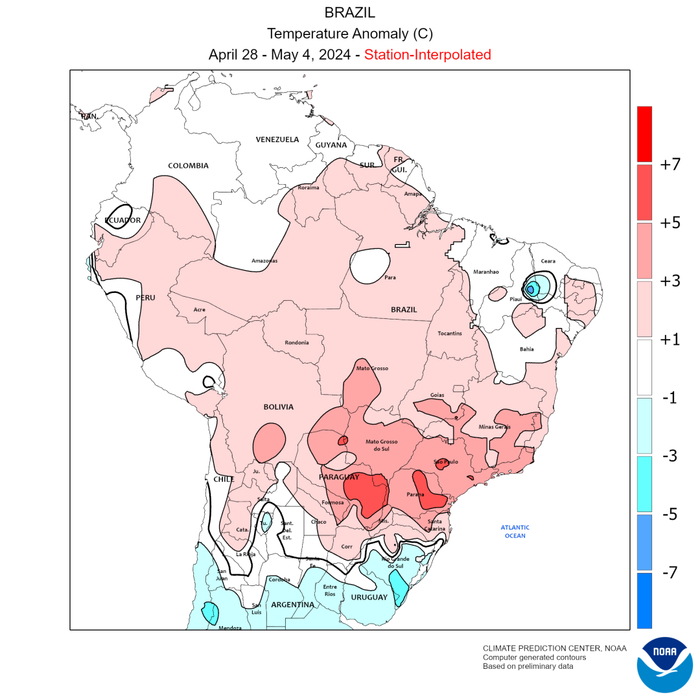 5月10日当周,巴西玉米主产区气温距平值偏高,中部地区降水与往年相差不大,南部地区降水较多;NOAA预计,巴西玉米主产州未来6-10日气温依旧偏高,巴西南部州南里奥格兰德州降水依旧较多,但巴西中部玉米主产州马托格罗索州、帕拉纳州干旱情况或将持续,不利于当地二茬玉米的生长发育。