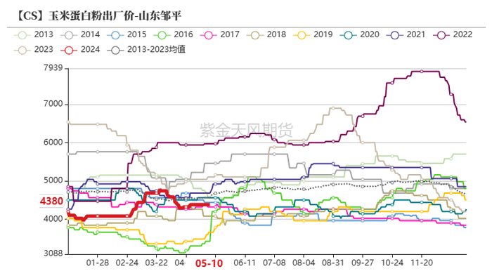 随着五一假期前后检修企业陆续结束,玉米淀粉行业开机率恢复性升高,供应端产量高位运行。