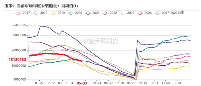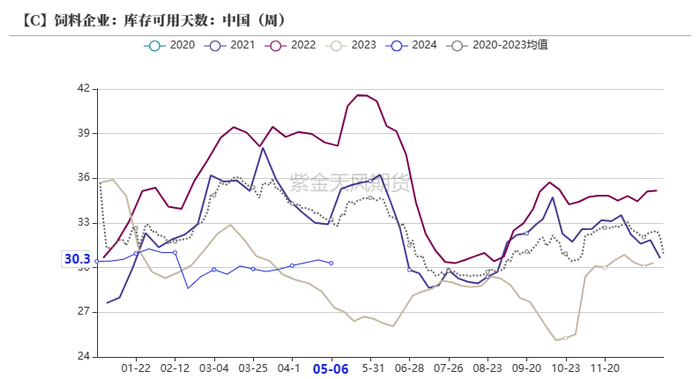 截止5月10日当周,样本饲料企业玉米平均库存30.33天,较上周减少0.19天,环比减少0.65%,同比增加11.09%。