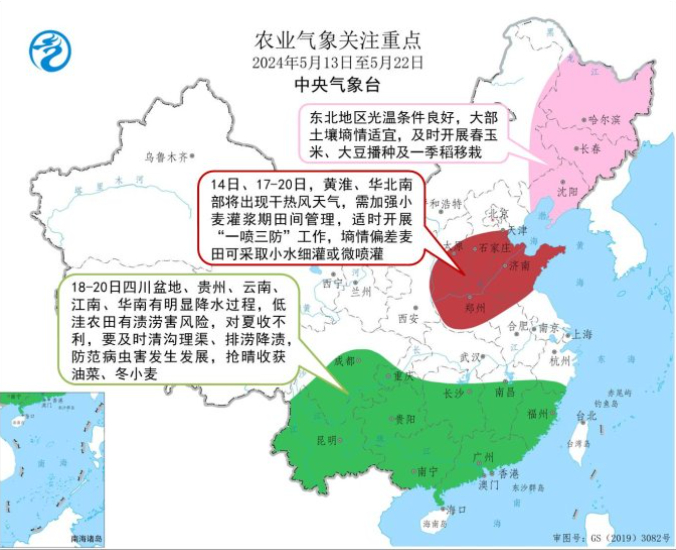 预计未来10天,东北地区光温条件良好,大部土壤墒情适宜,气象条件总体利于春玉米播种出苗。14日、17-20日,黄淮、华北南部将出现干热风天气,对小麦灌浆结实不利。