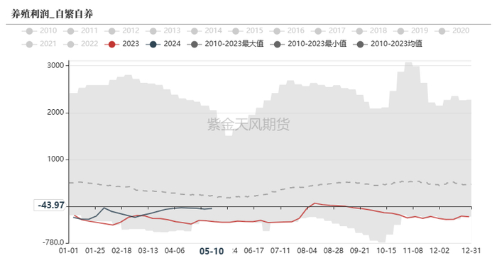 截止5月10日当周,毛鸡周度养殖利润-1.52元/只,上周-2.16元/只,较上周上涨0.64元/只。父母代种鸡周度养殖利润0.40元/只,上周0.38元/只,较上周上涨0.02元/只。蛋鸡周度养殖利润为11.41元/只,较上周上涨10.33元/只。