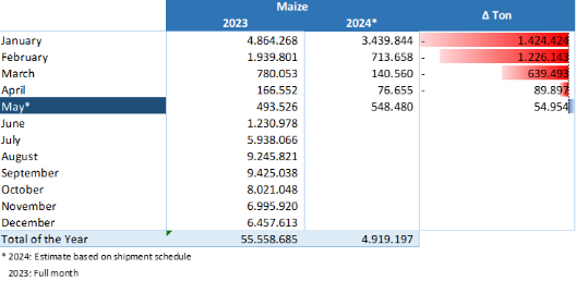 截止当周,巴西玉米2024年1-4月累计出口437.07万吨,相比去年1-4月出口775.06万吨,减少337.99万吨,降幅43.60%。