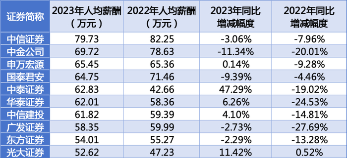中国新闻周刊梳理人均薪酬前十的券商公司发现,中信证券2023年的人均薪酬为79.73万元,中金公司、申万宏源、国泰君安、中泰证券、华泰证券、中信建投人均薪酬均在60—70万元区间内;广发证券、东方证券、光大证券则在50—60万元之间。