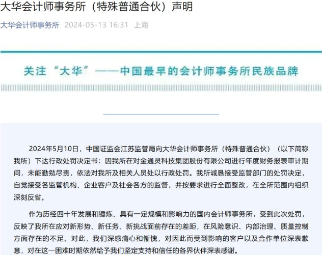 13日晚间,国内八大会计师事务所之一的大华会计师事务所贴出一纸声明,大华会计师事务所表示江苏证监局向大华下达行政处罚决定书,因大华在对金通灵科技集团股份有限公司进行年度财务报表审计期间,未能勤勉尽责,依法对大华所及相关人员处以行政处罚。大华诚恳接受监管部门的处罚决定,自觉接受各监管机构、企业客户及社会各方的监督,并按要求进行全面整改,在全所范围内组织深刻反省。