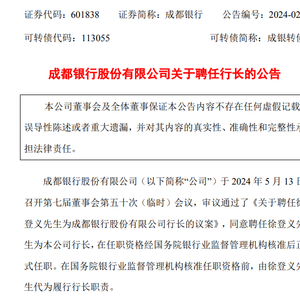 5月13日晚间,成都银行(601838.SH)发布公告,当日召开第七届董事会第五十次(临时)会议审议通过了《关于聘任徐登义先生为成都银行股份有限公司行长的议案》,同意聘任徐登义为公司行长,在任职资格经国务院银行业监督管理机构核准后正式任职。