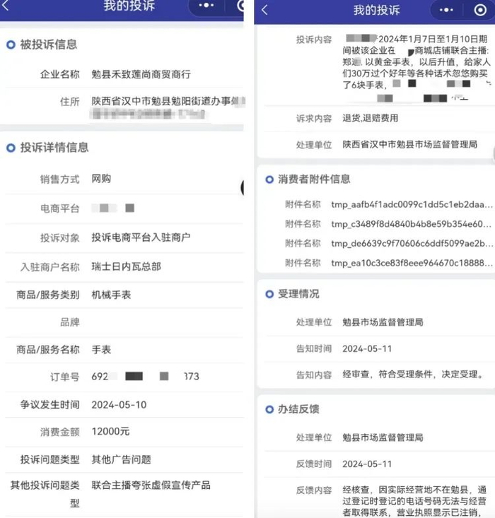 5月13日,在杭州工作的老张向记者报料:“只因听信主播在直播间的推销话术,今年1月我先后在某短视频平台花了12万多元下单买手表和纪念币、收藏币等,直到纪念币回购、想拍卖手表时才发现被骗。我在5月11日就投诉了主播和商家。”