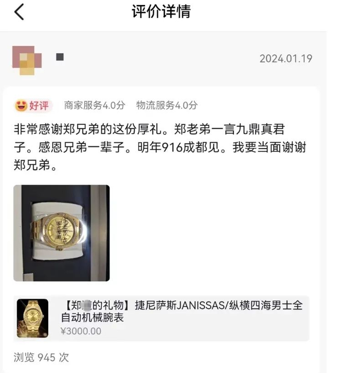 记者在老张展示在网店“捷尼萨斯JANISSAS”下单3000元买表的售后评价截图看到,时间:2024年1月19日;老张评价:好评;评语:“非常感谢郑兄弟的这份厚礼。郑老弟一言九鼎真君子,感恩兄弟一辈子。明年(2025年)9月16日成都见,我要当面谢谢郑兄弟。”