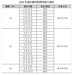 从发行安排来看,发行时间分布在5月中旬至11月中旬,国债发行期限分别为20年、30年和50年,发行次数分别为7次、12次和3次,付息方式均为按半年付息。